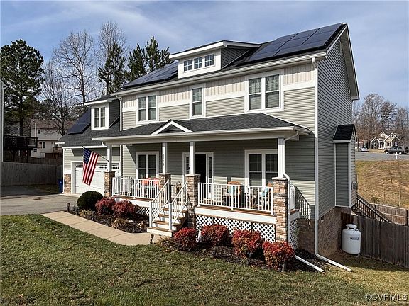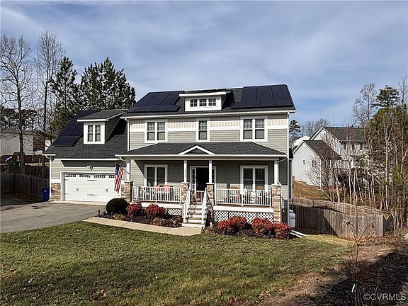 Welcome to Walnut Grove! Nestled in a private cul-de-sac, this stunning 2019 craftsman-style home by Huguenot Builders Inc. offers the perfect blend of elegance and modern convenience. Step inside to hardwood flooring throughout the first floor, wainscoting and crown molding in the flex room, and a beautifully designed kitchen featuring granite countertops, custom cabinetry, stainless steel appliances, and a cozy family room bookshelf. The gas fireplace adds warmth and charm, while the full front porch with partial stone columns invites you to relax and unwind. Out back, enjoy the spacious wood deck with dual staircases, plus a separate pet-friendly patio designed for your furry companions’ privacy. Upstairs, you’ll find four spacious bedrooms, including a luxurious primary suite with two walk-in closets and a spa-like ensuite bath featuring a double vanity, soaking tub, and separate shower. This home also includes solar panels, a shed, a Ring security system with cameras and monitors, and meticulously maintained landscaping with vibrant blooms and perennials. Located just minutes from Hull Street, Midlothian Turnpike, and with easy access to 288, 76, I95, Richmond Airport, and Ft. Gregg-Adams, this home delivers the ultimate in upscale suburban living and eagerly awaits its new owner. Have peace of mind with the Cinch Home Warranty provided by owners.