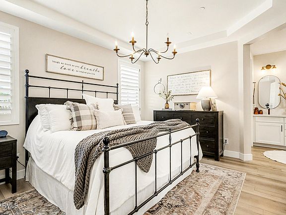 The primary suite is a peaceful retreat with a tray ceiling and spa-inspired bath featuring a quartz vanity, square under-mount sinks, custom framed mirrors, and a beautifully tiled super shower. Additional bedrooms include custom wood feature walls, giving each room its own designer touch.