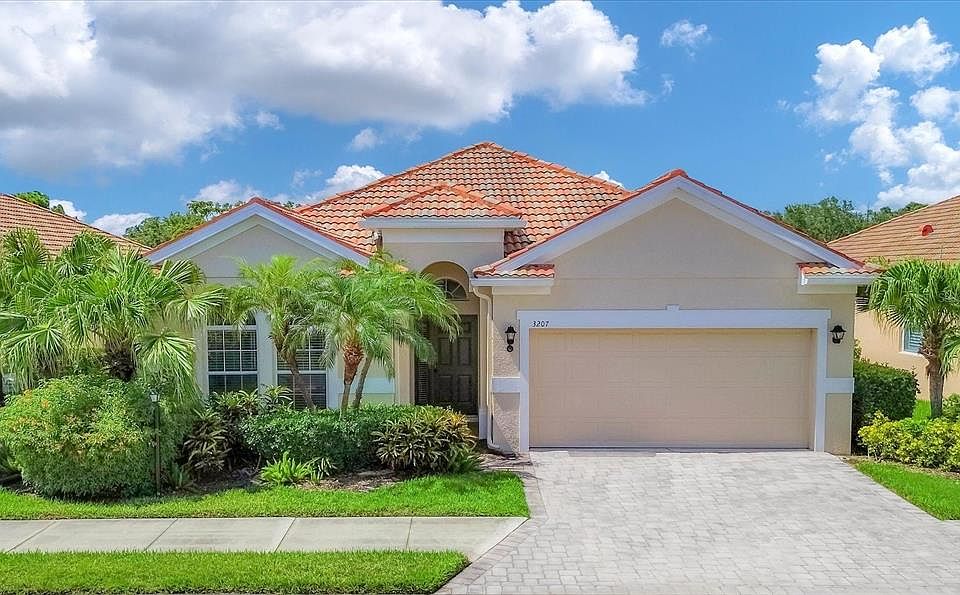 Move-In Ready, Turn-Key, Fully Furnished Sarasota Vacation Home. The three bedroom, two bath home has many of the upgrades buyers look for in a home: New Fans and Lighting, New Paint, Stainless Steel Kitchen Appliances (2022), Maytag Washer/Dryer (2021), A/C (2020) and Hot Water Heater (2021) and Hunter Douglas Vertiglide Window Coverings (2024) and more. The home has been a seasonal home for the owners. The Palm Lakes home designs include 9 foot ceilings, arched foyers, rounded corners throughout and architectural features with nooks and inset spaces to make the rooms more interesting. This provides the owners many possibilities of making the best use of the living spaces for their lifestyle. The architectural features & the warm neutral tones of the home add so much to the cozy style. The great room living area and the large, dining room overlook the lake and the fountain. The master bedroom is also located at the back of the home with views of the lake. Both baths have been updated with new cabinets, new lighting, new faucets and towel racks. The living room and dining room have triple and double sliding glass doors with Hunter Douglas Vertiglide Blinds for access to the lanai providing the lake views that owners love. Relaxing on the lanai is the perfect way to spend time bird watching or just enjoying the sunsets and the outdoor living. The dining room table opens up to have ten seats at the table for those large gatherings with family and friends. There is an office setup off the living room and another eating area to provide additional working space and seating areas. The second and third bedroom are in the front of the home with a second bathroom. A two-car garage completes the home. Maintenance free living gives more time to enjoy the Florida warm, sunny days. The single-family, one-story home is on a beautiful lake and provides the ultimate for bird watching and gorgeous sunsets! It is a short walk to the clubhouse, pool and playground. Community HOA fees are very reasonable and include the gated entry, community pool, clubhouse and playground, pest control and lawn maintenance. This community is a hidden gem off the University Parkway corridor. Palm Lakes is located just north of University Parkway. It is a small enclave of 114 beautiful, single-family homes with barrel tile roofs, paver lined driveways and mature landscaped yards. The lush landscaping, the surrounding lakes and the gated entry provide a private, secure environment. The community includes a heated community pool, clubhouse with pool table and playground for all ages including cornhole games for the adults. A new county park is a short walk from the community and has pickleball courts, walking foot paths and a dog park. Located within 6 miles of downtown Sarasota and Bradenton, UTC Mall and the new Moat Museum, Shopping and Restaurants and a few miles from the Sarasota Bradenton Airport and The Ringling Museum, it is the ideal Sarasota location. Siesta Key, Lido Beach and Anna Maria are a short drive to enjoy the Gulf Beaches and gorgeous Sunsets. Come and check it out for your new Florida lifestyle! Floor plan attached.