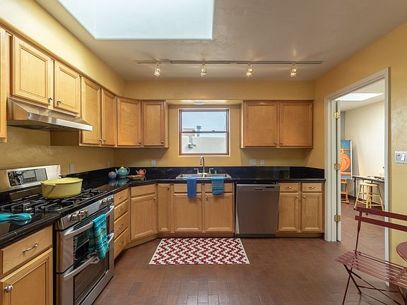 Pristine, immaculate, light & bright & sweet are only a few words that describe this super cute single level home adjacent to walking path located in the Pueblos de Sol Community. There are 2 bedrooms plus office/studio/playroom/laundry or whatever one would want/need it to be (located off of the kitchen), 2 baths and a 2 car garage. When entering you will find the living room with high ceilings and wood beams and a formal dining area. The large kitchen has black granite counters, tons of cabinets in addition to a built-in hutch with more storage/cabinets, stainless steel appliances (double oven) & track lighting. The master bedroom has a walk-in closet and en-suite bathroom with lovely tile tub enclosure. The second bath has granite counters. Features include: Radiant Heat-Swamp Cooler-Newer light fixtures-Newer faucets-Skylights-Brick floors-Front covered porch-Nice back yard with a shed-Front storm door and more. There is a park and walking trails in this neighborhood.