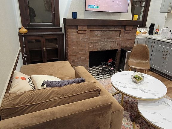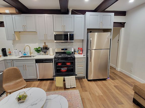 The open-concept living space showcases new wood-textured floors, quartz countertops, and stainless steel appliances. The unit comes fully furnished with stylish, contemporary furniture throughout. Additional amenities include in-unit washer/dryer, central AC/heat, and a beautifully tiled bathroom with well-lit vanity. While the unit does not include dedicated parking, there is ample street parking available on the quiet, neighborly streets. The backyard features fresh turf for outdoor enjoyment.