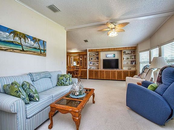 Home with wall of windows, open concept and built-ins. Bright and Cheery for Guests to feel at Home.... Spacious kitchen with cooktop range and breakfast bar. All kitchen appliances newer except cooktop. Refrigerator does not remain. Seller has enlarged carport, painted exterior, replaced windows on front of house, added A/C in Florida Room. Newer linoleum and carpet, resurfaced kitchen cabinets, painted interior, added tall toilets to bathrooms, new handicapped shower and wide Jacuzzi tub. Roof replaced 2018