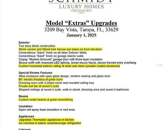 Pre-Construction. To be built. Located in the highly desirable Boulevard Heights neighborhood within the acclaimed Plant school district, 3209 W Bay Vista Avenue is a state-of-the-art preconstruction, luxury single-family home that boasts outstanding features designed with both hurricane hardening and climate resilience in mind. The entire home is built to meet or exceed the latest wind and FEMA flood requirements, with masonry exterior walls on both the first and second floors. It features "Impact Rated" insulated Lo-E windows and sliding glass doors, a hurricane wind zone (W6) rated "Modern Grooved" insulated garage door, and open cell foam insulation. Additionally, it has a generator switch prewire and gas plumbing for the generator, range, and tankless water heater, as well as a hardwired security system with camera-ready prewire points at all four outside corners.     The contemporary modern architecture and design of the home include a modern exterior with clean lines and multiple mixed design surfaces, complemented by opulent contemporary interior design selections and fixtures. Inside, you'll find a custom horizontal cable railing for the interior stairs, a modern linear fireplace, and a stunning floor-to-ceiling double-sided glass wine enclosure. The lavish gourmet kitchen is equipped with Thermador appliances, including a built-in refrigerator and freezer, a commercial Thermador gas range and hood with a full-height quartz backsplash and pot filler, and a built-in espresso machine, wall oven, dishwasher, and microwave drawer. The spacious quartz island and kitchen layout provide plenty of room for culinary creations.    The extravagant resort-style master wing features spacious, coffered 11-foot ceilings in the dressing area, master bedroom, and master closet. It includes a full-length three-sided mirror, an ensuite dressing area, a private morning bar/wet bar, and a massive shower and tub wet area with frameless glass panels and floor-to-ceiling tile. Outstanding design features throughout the home include 11’4” first-floor ceilings and 10’-11’ second-floor ceilings with 8-foot-tall doors, private en-suite baths for all bedrooms, and custom-selected luxury flooring and bath tile. The flex space on the second-floor loft area can be customized as a second home office, in-law suite, or home theater.    The custom pool package completes the luxurious outdoor living experience, featuring a sun shelf, color LED lights, Pebble Tec interior, bubbler fountain, and bullnose coping. This home perfectly blends modern design with practical resilience, offering a safe and stylish living environment in a highly sought-after location in the Plant High school district.