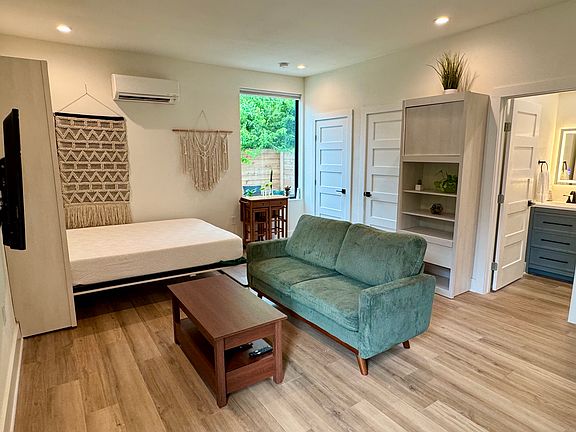 This 400 sqft fully furnished studio has all new appliances and smart set up. Queen sized Murphy bed folds up to provide a comfortable living area with couch and TV. Full shower with sleek design. Closet with washer/dryer. Comfortable kitchen with stove/oven, fridge, and microwave.