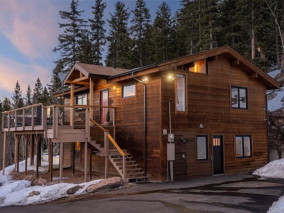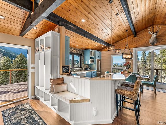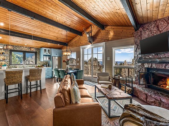 Absolutely stunning remodeled home. Add to that, the INCREDIBLE VIEWS from the living areas both inside and outside on the deck. This Christopher Lane home has been used (and is currently being used as a short term rental. You too could purchase this home as a mountain second home and have it rented while you aren't using it! Or purchase it as your primary home - it is close to the city and offers easy access to Red Rocks!!! Every inch has been completely remodeled. The wrap-around deck includes a hot tub, a kitchen window that opens to pass through drinks or food for entertaining and of course - stunning VIEWS! There are two living areas on the upper and lower level. The primary suite is beautiful and comfortable with a walk-in closet and a gorgeous 5 piece bath. Your guest bath is on the upper/main level and the two (2) additional bedrooms are on the lower level with a 3/4 bath for use by both bedrooms. The lower level has access by stairs from the upper level as well as a door in the back from the detached garage and a sliding door onto the lower level patio. If you like garages you will LOVE this garage - it is huge - 2 car garage door opening will accomodate 4 vehicles (2 side by side and 2 tandem) as well as an RV garage door opening which will accomodate up to 3 standard vehicles or an RV. Heated garage with enhanced lighting and power for projects!