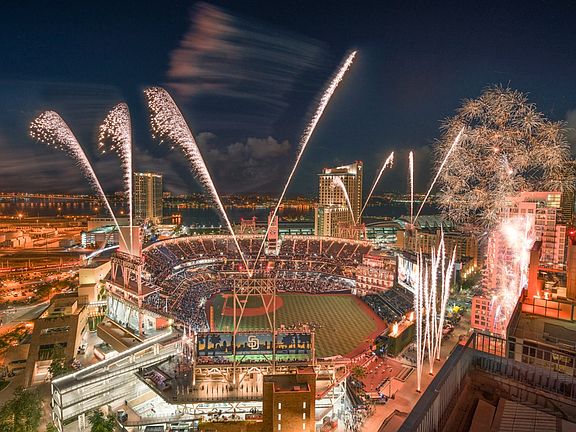 TRUE TOP FLOOR PENTHOUSE LEVEL UNIT. Dual balconies off the living room and master bedroom, Coronado Bridge water views to the south and Balboa Park to the north. Incredible rooftop SkyBox that looks directly in the stadium with BBQ's, TV for viewing and lounge cushions for laying out. New hardwood flooring, granite countertops, custom master bathroom shower high speed webpass wifi, TV's and everything you need to move in with just your suitcase. ICON has it all: SkyBox (observation deck w/BBQ), lounge, fitness center, theater, 24 hr. security/concierge and proximity to SD's finest restaurants, bars and entertainment!