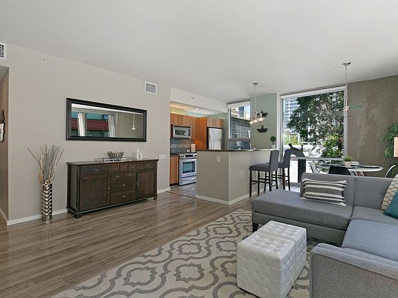 This elegant two bedroom, two bath boasts an open airy floor plan with Floor to Ceiling Windows providing lots of natural light. Plush furnishings, Newly Installed Hardwood Floors throughout unit, with New Neutral Carpet in both Bedrooms, fully stocked kitchen, private patio. Master bedroom has two sinks, a walk-in closet and a full size tub, second bedroom is its own room off to the side with its own private bathroom featuring a stand up shower. This Unit is situated on the south side of the building with Views of the Icon stylish urban courtyard. This community is a fusion of four buildings.
