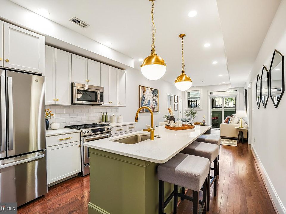 NEW PRICE! Welcome to Capitol Hill East and this spacious 2-bedroom, 2-full bath condo with PRIVATE PATIO and a showstopper kitchen. Located at The Brinkley, a boutique 10-unit building expertly renovated by Lock7 in 2013, this glamorous home has one of the largest layouts in the building. Features include engineered HARDWOOD FLOORS throughout, recessed lighting, upgraded brass light fixtures, 9 ft ceilings, an abundance of natural light, and an ideal layout for entertaining and hosting guests. The fabulous, huge chef's kitchen features gas cooking, a brand new GE French-door refrigerator, massive 8 ft CENTER-ISLAND with white QUARTZ counters and Benjamin Moore Rolling Hills verdant earthy green lower cabinets, new brass knobs & pulls, and a pantry with custom shelving. The corner primary bedroom has its own en suite bathroom while guests can use the second full bath with new chair rail and designer wallpaper located just off the living room and adjacent to the 2nd bedroom. Sliding glass doors open to your own sunny west-facing 15'6 x 4' private PATIO. This stunning starter home also has in-unit front-loading WASHER & DRYER and CENTRAL heating and cooling. Plant your own herbs, vegetables, and flowers in the community garden in the alley accessed via membership where you and your friends & neighbors can enjoy the grill, firepit, lounge chairs and tables as if it were four very own backyard semi-private entertaining oasis. Enjoy nearby amenities like the Pretzel Bakery, Lincoln Park, Harris Teeter, Reservation 13, The Roost, Barracks Row, Eastern Market, and H Street Corridor. Exceptional city living at an accessible price and low condo fee in one of DC’s most dynamic neighborhoods. The community is also PET-FRIENDLY AND investor-friendly (6-month minimum lease term). Just a few blocks to Stadium-Armory METRO. Separately-deeded assigned OFF-STREET PARKING in the rear right next to your gated PRIVATE ENTRANCE completes the package.