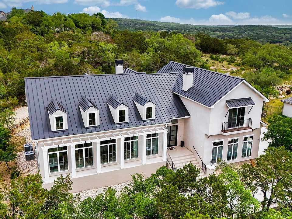 Welcome to this stunning estate home by Haven Builders, located in the highly sought-after River Crossing subdivision. Nestled on a private 1.16-acre lot surrounded by mature trees, this modern architectural masterpiece offers a perfect blend of elegance and functionality, seamlessly integrating with its natural surroundings. Step inside to discover expansive windows that frame breathtaking views, bringing the beauty of the outdoors into every room. The open-concept living, dining, and kitchen areas are accentuated by tall ceilings and the striking presence of exposed iron-strapped beams, creating a sense of grandeur. The wrought iron double-door entry and railings add a touch of sophistication, while panoramic windows and sliding doors further enhance the connection to the outdoors. The state-of-the-art kitchen is a chef's dream, featuring a Liebherr side-by-side refrigerator, a Bosch electric 5-burner cooktop with a convenient pot filler, built-in double ovens, and a sleek microwave drawer, offering both style and top-tier functionality for all your culinary needs. Additional features of this exceptional home include a climate-controlled safe room, generous walk-in attic space, spray foam insulation for energy efficiency, a Tesla charger for modern convenience, and epoxy-coated garage floors that provide durability and a polished finish. Outside, enjoy ample parking, soffit and exterior lighting, and a spacious covered patio perfect for entertaining. The home's luxurious patio features espresso tongue and groove ceilings, adding warmth and texture to the design. The outdoor kitchen is an ideal space for al fresco dining, offering a seamless transition from indoor to outdoor living. Every detail has been carefully considered to provide both style and comfort, ensuring an exceptional living experience. This is more than just a home; it's a lifestyle-where luxury meets nature in the heart of River Crossing.