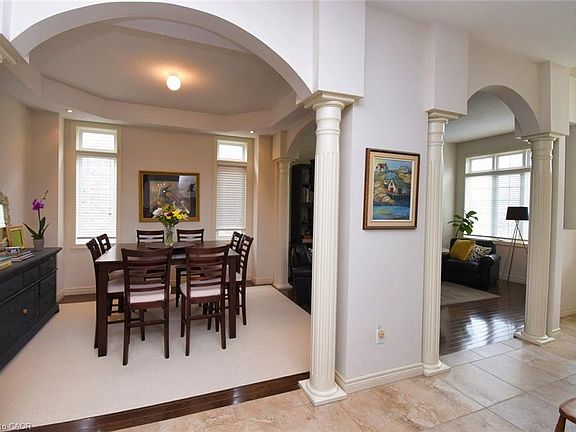 Elegant Family Home on a Quiet Ancaster Court Across Conservation Welcome to this meticulously maintained executive home nestled on aserene court in Ancaster, directly across from picturesque conservation lands featuring tranquil walkways and a scenic pond. Step inside todiscover a thoughtfully designed main floor boasting soaring 10-foot ceilings, rich architectural details including coffered ceilings in the formaldining room, and a spacious, light-filled eat-in kitchen. Perfect for entertaining, the kitchen opens seamlessly to the inviting family room with acozy gas fireplace, and offers direct access to a large stone patio — ideal for outdoor dining and relaxation. The backyard is truly a showstopper:professionally landscaped with mature trees, shrubs, and impressive armour stone, offering both privacy and beauty in abundance. Upstairs, thegenerous primary suite features a walk-in closet and a luxurious 5-piece ensuite bath complete with a soaker tub and separate glass shower. Asecond bedroom enjoys its own private 4-piece ensuite, while the third and fourth bedrooms share a well-appointed Jack and Jill 4-piecebathroom — perfect for family living. The expansive, unfinished basement offers 9-foot ceilings, oversized windows, and a separate side entrance— an ideal canvas for future living space or an in-law suite. Recent updates include a new furnace (2022) and roof (2021), ensuring peace ofmind for years to come. Don't miss this rare opportunity to own a beautifully cared-for home in one of Ancaster's most desirable and peacefullocations.