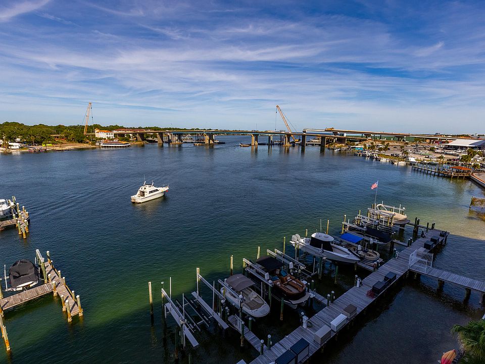 Awesome views from this 2 bedroom/2 bath penthouse unit on the 6th floor. This top floor unit comes with 10' ceilings(no other floor has ceilings that high), 2 reserved covered garage spots (next to each other) and a storage unit, the biggest boat slip in the complex at 43'. The boat slip comes with 50 amps of power and water and 2 marine dock boxes. Gated community. Short term rentals allowed. Bring your own furniture as it's being sold unfurnished however kitchen appliances stay. Unit is rented until March 31. Available to move in April 1, 2026.