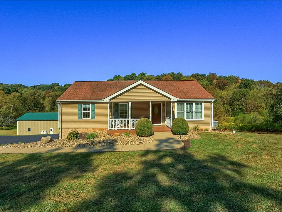 CALLING ALL CAR ENTHUSISTS! 32X46 HEATED DETACHED garage with 10K LB lift and 12x14 door complement the scenic views on 3.7+ acres with a custom built ranch! Exquisite open floor plan with cathedral ceilings call from the front door of this luxurious 3 bedroom, 2.5 bathroom home perfectly situated minutes from 79. Cross the threshold into a warm welcome that includes Brazilian cherry hardwood floors, stylish lighting, neutral tones, and vaulted ceilings. Be inspired to serve magnificent meals around the 8ft island! Natural light floods every room (even the LL) making sunshine always accessible! The pleasing primary contains 2 walk-in closets and a large bath that includes a jetted soaker tub and separate shower. Hosting gatherings is a breeze. Off the dining room, composite decking with a retractable awning allows everyone to enjoy nature. Want to stay inside? No problem! The finished walkout LL is HUGE with 9ft ceilings and 1/2 bath. Great shops & restaurants just minutes away!
