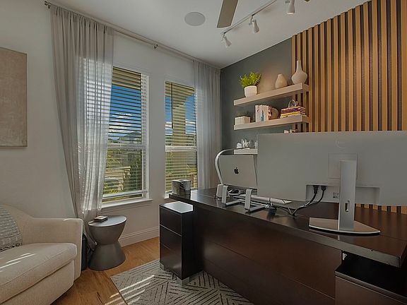Gas fireplaceModern slat-accent wallHardwood flooringOpen-concept floor planGranite countertopsCovered patioFull theatre room