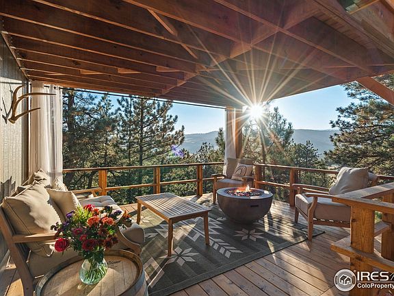 Nestled in a serene setting just 25 minutes from downtown Loveland, this unique property offers privacy, mountain views, and a lifestyle designed for both comfort and versatility. Zoned for horses and surrounded by mature trees and landscaping, the home is perfectly positioned to capture sweeping views of Pinewood Reservoir and the surrounding foothills. With multiple kitchens, entrances, and living areas, this residence is ideal for multi-generational living. Bedroom 3 is a detached in-law apartment, offering independence while staying close. Inside, you'll find multiple office spaces (one easily convertible into a 4th bedroom), abundant storage, and several fireplaces-both indoors and out-for cozy gatherings year-round. Outdoor living shines with expansive decks and patios on multiple levels, winding paths throughout the property, and a welcoming outdoor fireplace. Whether entertaining or simply soaking in the peaceful surroundings, every corner invites connection with nature. Car enthusiasts, hobbyists, or those in need of serious workspace will love the oversized garage complex featuring a recreation room, shop, craft room, loft, carport, and patio. Additional detached garage space provides even more storage and flexibility. Close to Carter Lake and Pinewood Reservoir recreation areas and trails, this property is the perfect balance of retreat and convenience-offering room to spread out, work, play, and live the Colorado lifestyle to its fullest.