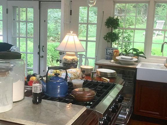 Furnished Two old farm houses dragged up the street by oxcart and made as one on 4 acres, 2 are woods. 3 fire places large eat-in kitchen , dining room with fireplace and back stairs, living room with fireplace Gass logs , 1/2 bath off hallway to front door, downstairs bedroom with private bath. Up stairs front bedroom with fireplace and connected to full bathroom off hallway, Walkthrough bedroom with two twin beds. Master bedroom on back of house. Tenant responsible for all utilities, trash removal, and lawn mowing.