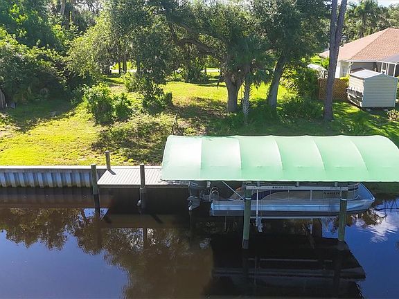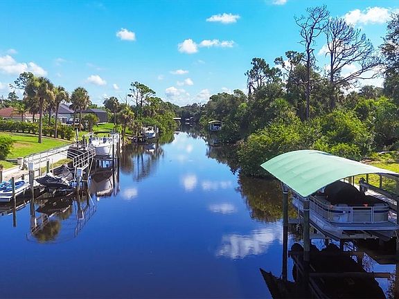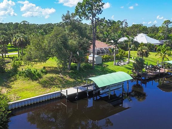 Boater’s Paradise with GULF ACCESS is only waiting for your imagination for the perfect Florida dream home. The Gulf, Charlotte Harbor and Myakka River are all within a short boat ride along the Apollo Waterway. This lot has been cleared, leaving beautiful oaks and palms and spectacular sunsets to decorate your new home, all without being located in a flood zone! Concrete seawall (80’), composite dock, and boat lift installed in 2021; lift canopy added in 2024. A temporary power pole has been installed for the boat lift and RV-hookup while building your custom slice of paradise. An additional 160 SqFt have been released from the canal easement to provide a seamless transition for a pool to connect to the boat dock. Spend your days fishing, boating or sipping your favorite beverage on the dock, watching the incredible sunsets. This property offers the perfect blend of tranquility and serenity, while being so convenient to excellent beaches, restaurants, shops, golf courses and endless outdoor adventures, in between North Port and Port Charlotte.