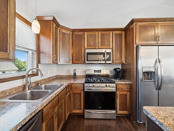 Beautiful home in Gateway Meadows. Spacious open concept with vaulted ceiling and hardwood floors. Includes a 3 season porch and 10x8 storage shed. Fenced in yard. Modern kitchen includes all stainless steel appliances and center island. Large master bedroom with on-suite bathroom and walk in closet. Lots of natural light. Lookout windows in basement. Basement has a large family room with luxury vinyl flooring. 3rd bedroom and bathroom with a walk in closet. This home is ready to move in and enjoy! Quick close possible.