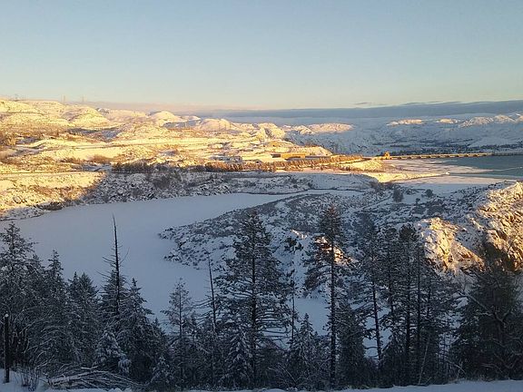 It has a panoramic, elevated view of the Grand Coulee Dam and the surrounding area.
