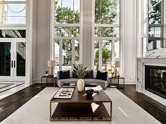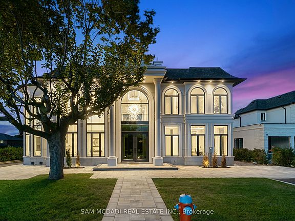 Welcome to 321 Morden Rd, a brand-new French Chateau-inspired estate that seamlessly blends timeless elegance with modern luxury. This custom-built residence offers over 5,000 sq ft. of meticulously designed living space across three levels, featuring premium finishes, soaring ceilings, and an abundance of natural light. The exterior architecture impresses with grand symmetry, tall columns, arched windows, detailed stonework, and a striking double-door glass entry. Inside, every detail has been thoughtfully crafted for both sophisticated entertaining and everyday comfort. The main floor boasts 23-foot ceilings in the living and great rooms, with floor-to-ceiling windows that flood the space with natural light. Tray ceilings with integrated LED cove lighting, recessed spotlights, and in-ceiling speakers create a modern ambiance, while open-to-above areas are highlighted by stunning light fixtures. Premium granite and hardwood flooring flow throughout, leading to the kitchen complete with built-in appliances, quartz countertops, an oversized island, and custom cabinetry. A dedicated home office with dramatic windows completes this level. Upstairs, the primary suite features a spa-like ensuite with a freestanding tub, rainfall shower, double vanity, and a custom walk-in closet. Three additional bedrooms each offer their own ensuite and custom storage. The finished lower level includes a spacious bedroom, full bath, living area, second kitchen, and a walk-up to the backyard - perfect for multi-generational living. This home offers 4+1 bedrooms, 7 bathrooms, a 2.5-car garage, extended driveway, 10-foot basement ceilings, and a stone patio with lush green space. Ideally located just minutes from Hwy 403, schools, shops, and restaurants, 321 Morden Rd delivers the perfect balance of elegance, convenience, and lifestyle.
