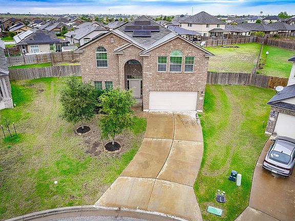 Spacious and welcoming, this two-story 4-bedroom, 3-bath home offers 3,022 sq. ft. of living space on an almost half-acre cul-de-sac lot. The floor plan features formal living and dining areas, a comfortable family room, and an upstairs bonus room perfect for a playroom, media space, or home office. One bedroom and a full bath are conveniently located on the main level. The island kitchen offers abundant workspace and storage, a large pantry, and a bright breakfast area. Upstairs, the oversized primary suite offers a sitting area and includes a dual vanity, soaking tub, separate shower, and a generous walk-in closet. All additional upstairs bedrooms also include walk-in closets. Solar panels on the roof add energy efficiency and help reduce utility costs. A covered back patio overlooks the expansive backyard, offering endless possibilities for outdoor living, entertaining, or future improvements. This home delivers exceptional space, comfort, and a desirable cul-de-sac location.