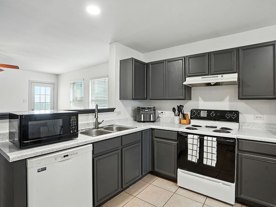 This 4-bedroom, 2-bath home offers a spacious and functional layout perfect for everyday living. The open living and dining areas flow into the kitchen, which features epoxy-coated countertops, dark-painted cabinets for a modern touch, and a large standalone island that adds extra prep space and casual seating options. A bright dining area sits just off the kitchen, ideal for family meals or entertaining.