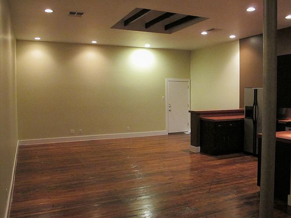 Long leaf hardwood floorsModern kitchenLarge social areaExposed brick wallsDark cabinetry