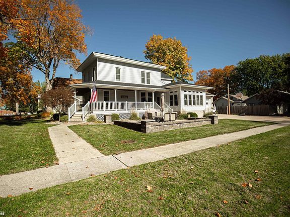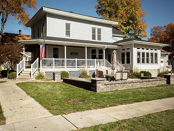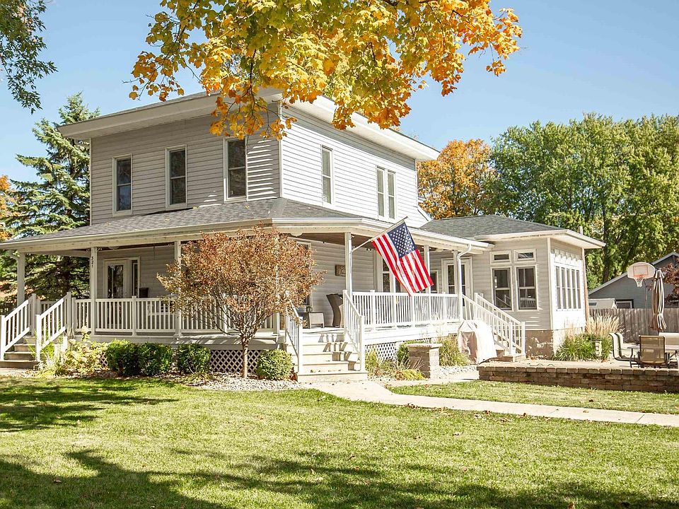 This stunning 2,400 sq. ft. residence is the epitome of classic charm and modern comfort. Situated on a corner lot, this home exudes character and offers a picturesque wrap-around porch with a porch swing for those lazy summer afternoons. Inside, you'll find a bright and beautiful sunroom complete with a gas fireplace, perfect for cozying up and watching the snow fall. The main floor boasts 10 ft. ceilings, original woodwork, an open floor plan and a beautifully updated kitchen with an abundance of storage. The charming window nook and custom-built ins add to the appeal of this home. Extra space in the basement make for a great office. The master suite is a true retreat with a recently updated bathroom featuring a Jacuzzi tub and double vanity. Also on the second floor are two more bedrooms with a Jack and Jill bathroom. Complete with a large mudroom, a newly finished, heated 3-car attached garage (2021), a new furnace (2022) and a new roof (2023), this home is ready for you!