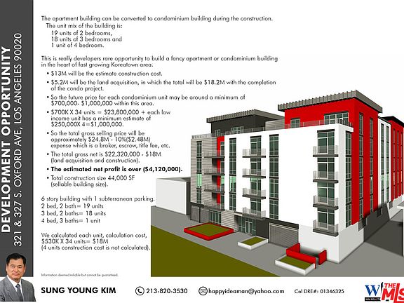 Developers rare opportunity !! Two lots (321 & 327 S Oxford Ave...Total $ 5.2M) combined for redevelopment. Total lot size is larger than 18,000 SqFt in Koreatown prime location. Buyer to verify property measurements. TOC determination letter of apartment building of total 38 units was already issued and we are expecting building RTI by the end of June, 2019. The apartment building can be converted to condominium building during the construction. The unit mix of the building is: 19 units of 2 bedrooms, 18 units of 3 bedrooms and 1 unit of 4 bedrooms. This is really a developers rare opportunity to build a fancy apartment or condominium building in the heart of fast growing Koreatown area.