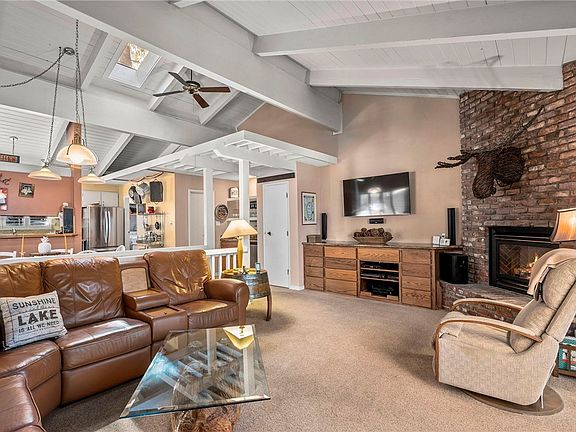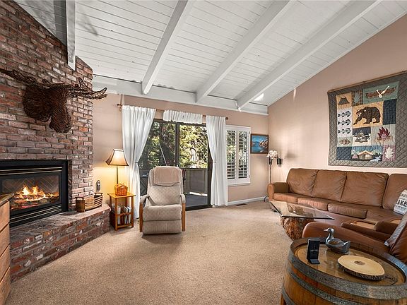 Updated 3-bedroom condo with an open floor plan featuring high vaulted, open-beamed ceilings in the main living area, a brick hearth gas fireplace, and a walkout deck with serene forest views. The main level includes a wet bar next to the dining area, a half bath, and a kitchen with slab granite counters, updated appliances, and an adjacent laundry room. Downstairs, you'll find three bedrooms and two full baths. An outdoor storage closet provides extra space. The complex offers two pools, allows vacation rentals, and is ideally located near the Recreation Center, private beaches just three blocks away, the Incline Village Championship Golf Course, and Diamond Peak Ski Area.