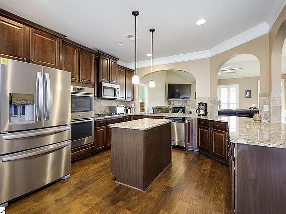 Better than new!! This builder spec home is ready for its new owner. This hard to find versatile floor plan has 4 bedrooms with the master on the main floor and 3 full bathrooms. There are so many upgraded features in the home, including heavy crown molding, coffered ceiling in the dining area, beautiful light fixtures and large upgraded ceiling fan in the living area. The kitchen features granite countertops, travertine stone backsplash with an island and never-ending counter space surrounded by beautiful archways. With double ovens, gas cooktop, and large walk-in pantry this is truly a gourmet kitchen. The large master bedroom with trey ceiling is on the main floor and 2 additional bedrooms are on the main floor. The fourth bedroom with full on-suite bath is upstairs. This home has been very well maintained and updated with new paint, plantation shutters, and custom window coverings. It has a fully fenced in back yard and beautifully landscaped front entry with rocking chair front porch. Situated minutes from downtown Simpsonville, I-385, and Woodruff Road.