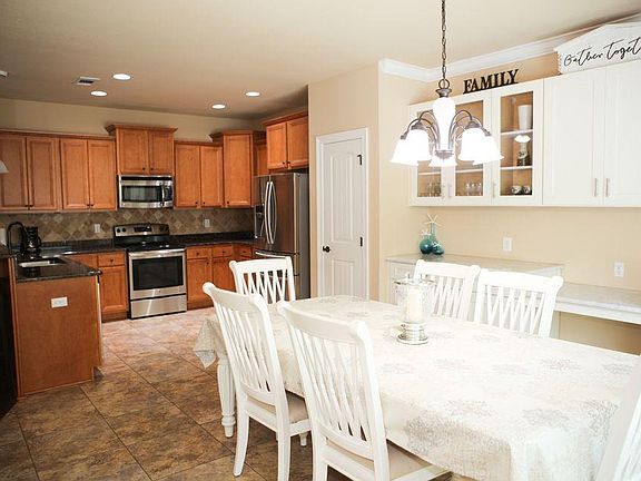 Inside, the open-concept layout features a spacious kitchen with granite countertops, stainless steel appliances, and a walk-in pantry, flowing seamlessly into the dining area and living room. The living room boasts tray ceilings and a working fireplace, creating a cozy yet elegant space for entertaining or relaxing.