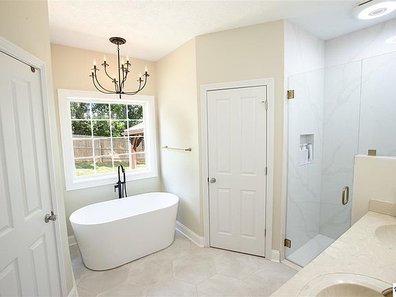 Cozy gas fireplaceElegant new freestanding bathtubBluetooth rgb speakerDual vanityOverlooks the fenced backyardLarge eat-in kitchenBrand-new quartz slab shower