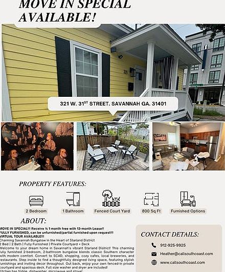 Welcome to your dream home in Savannahs vibrant Starland District! This charming fully furnished 2-bedroom, 2-bathroom bungalow blends classic Southern character with modern comfort. Convert to SCAD, shopping, cozy cafes, local breweries, and restaurants.