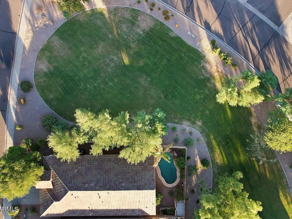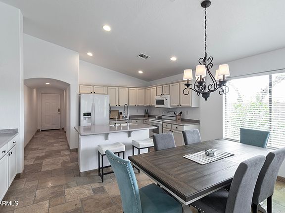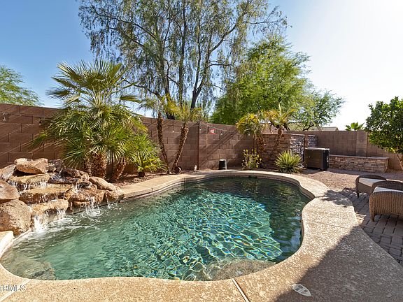 Minutes away from all Queen Creek has to offer, this spacious home lives larger than it's numbers. Situated on a private Corner Lot, this 4 Bedroom, 3 Full Bathroom home has many upscale features: Dual Primary Suites, established Landscaping, Solar Panels and a Stunning Pool with waterfall fountain. Step inside to find limestone floors throughout and an open concept kitchen-living area with a cathedral ceiling - perfect for entertaining family & friends. The pool features BOTH a heater and cooling unit for year round enjoyment. The two en suite bathrooms feature designer stone tile, spacious showers and plenty of natural light.