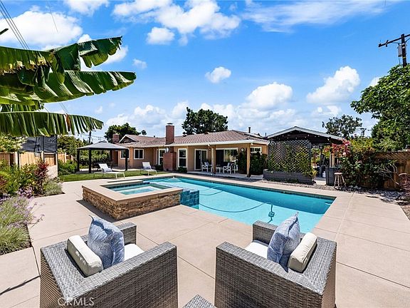 The outdoor space is a private oasis featuring a saltwater pool and spa, extensive hardscaping, artificial turf near the pool, and new drainage systems throughout. The landscaping is both striking and sustainable, with accent lighting, David Austin roses, drought-tolerant plants, a vegetable garden, and a wide variety of mature fruit trees including avocado, pomegranate, fig, peach, lime, and more.