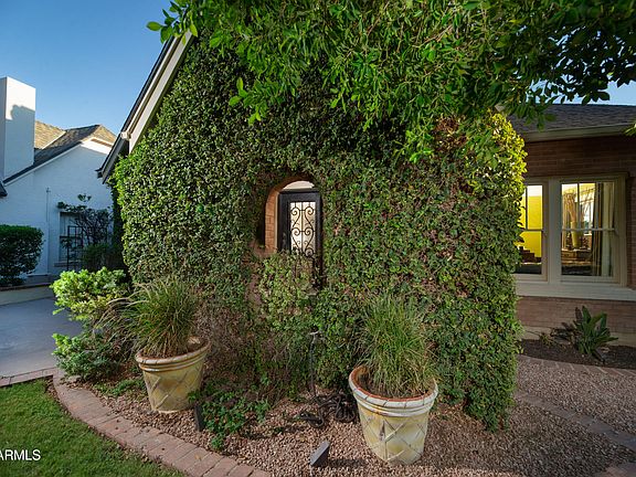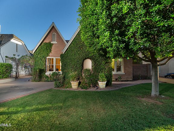 This stunning red-brick Tudor sits proudly on one of the best blocks in popular Willo Historic District! Thoughtfully reimagined inside and out by current owner, a renowned local interior designer, this home blends timeless historic charm with sophisticated design. The inviting floor plan features both a formal living room & a spacious family room—each with/ a charming brick fireplace. The kitchen flows seamlessly into a large dining room, perfect for entertaining. Two private bedroom wings, each with their own bathroom, provide comfort and privacy. Historic details abound, including original hardwood floors, wood-framed windows, and built-in closets/cabinetry in both hallways. A 400' detached structure offers incredible potential—convert back into a rear-entry 2C garage or guest casita! Outside, lush landscaping showcases mature Tipu, Ficus, and Cypress trees, complemented by a tranquil fountain and brick and stone patios for a private garden oasis. Don't miss this rare opportunity to own a true architectural gem in one of Phoenix's most beloved historic neighborhoods.