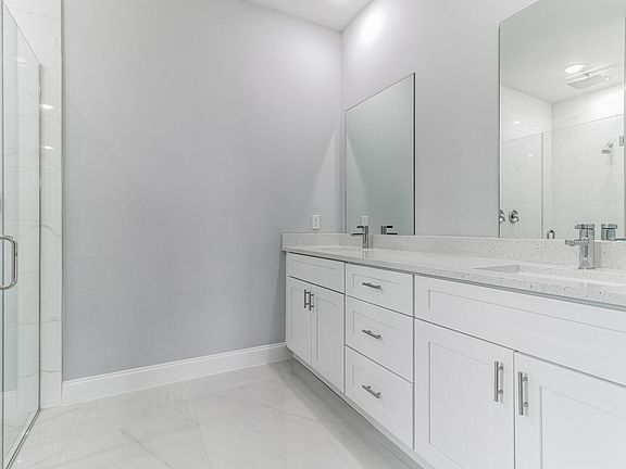 The master bathroom is a true oasis, featuring a spacious shower with a glass door, his and hers separate walk-in closets, and double sinks. The layout of the home is thoughtfully designed, with a private master suite providing a peaceful retreat for relaxation and rejuvenation.