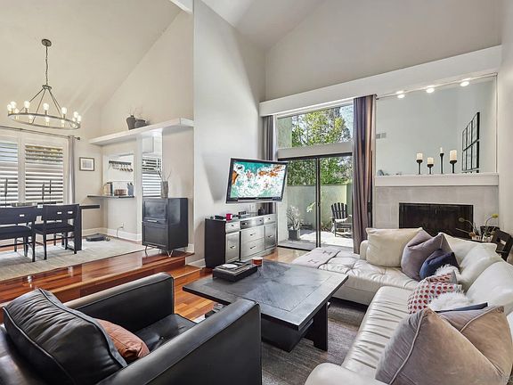 Bright, open end unit in highly sought-after Eastbluff. Rarely available this 2br/2ba townhome with attached 2-car garage is located in the highly desirable neighborhood of La Jolla/UTC near UCSD, shopping, trolley, restaurants and easy freeway access. This end unit feels like a detached home with impressive high vaulted ceilings and open floorplan with west facing living room opening to an oversized patio perfect for relaxing and entertaining. Upgrades include solid kempas hardwood floors, remodeled kitchen with solid alderwood painted cabinet doors, granite countertops, stone flooring, and stainless steel appliances; new dimmable lighting throughout, including recessed lighting in both the living room and kitchen, and fandaliers in both bedrooms. Both bathrooms have been upgraded with stone and granite finishes.