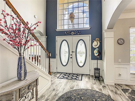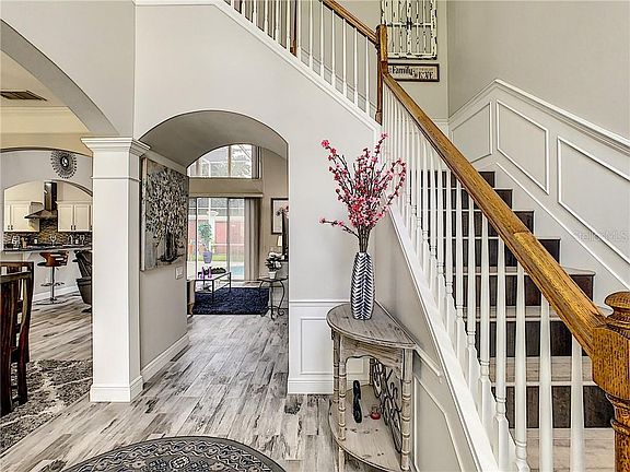 PRICED TO SELL and FULLY RENOVATED IN 2018! Don't miss this beautiful pool home in the Eagle's Reserve Community at Hawks Nest. The lovely exterior is an inviting entry way to your perfect family home. As you walk into the foyer, the gorgeous stairway and expansive space will immediately invoke a warm feeling of family. A home office, so necessary today, is by the front door while to the left a comfortable dining room with wainscoting flows through an archway to a great room, which includes a family room, breakfast bar and gourmet kitchen. The soaring 20-foot ceilings, pool vista, and expansive kitchen create a generous space within which you can create family memories together. New quality KitchenAid appliances include a glass cooktop, built-in microwave, convection oven and a lighted pot rack over the island will allow you to create meals to amaze family and friends. The walk-in pantry hides the necessary ingredients. Plentiful, white cabinets are a perfect foil for the Black Galaxy granite countertops. The nearby laundry room includes a utility sink. Move through the sliding doors to enjoy your large patio, perfect for entertaining at a summer cookout within a screen enclosure. Next, retire to your spacious master suite. Unwind while reading in your sitting area or relax in either the jetted tub or glass-encased shower of your ensuite master bath. Finally, as you land upstairs you can't miss the large loft where you can watch your favorite movies or play video games. On both sides of the loft you will find two expansive corner bedrooms. Each pair of bedrooms share an updated bathroom design with double vanities and glass showers; plenty of room to avoid those arguments over time to get ready! The location is absolutely stupendous. The Loop and all the shopping conveniences are a stone's throw away and DISNEY WORLD is a straight seven mile drive on Central Florida Pkwy. Renovations include: new roof (2017), new flooring throughout, interior and exterior paint, new bathrooms throughout, new kitchen, pool resurfacing with Sunstone Quartz finish all in 2018. All the kitchen appliances include existing manufacturer's warranties.