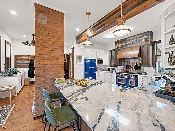 Welcome to 3210 Scranton Rd—an exceptional home where timeless character meets thoughtful modern updates. This truly unique and gorgeous property showcases breathtaking original craftsmanship, including rich woodwork and a grand staircase that makes a stunning first impression as you step through the front door. The spacious living room features a beautiful bay window that floods the space with natural light and flows effortlessly into the cozy family room with large windows and a decorative fireplace—perfect for movie nights or relaxing evenings in. The kitchen is a true showstopper, blending farmhouse charm with upscale style. Outfitted with striking high-end appliances in a rich blue finish, this space is as functional as it is beautiful. You’ll love the ample white cabinetry, granite countertops, large island with breakfast bar, farmhouse sink, and statement copper range hood. A wood-burning stove adds warmth and character, creating the perfect setting to gather with friends and family. A full bath with a clawfoot tub, pedestal sink, and gold hardware completes the main level with timeless elegance. Upstairs, retreat to the luxurious primary suite, featuring high ceilings, beautiful windows, and a walk-in closet with custom organization. The en-suite bathroom offers a spa-like experience with a soaking tub beneath a skylight, dual vanity with generous storage, and a large walk-in shower with a built-in bench. Three additional spacious bedrooms, another beautifully updated full bath, and a convenient laundry room complete the second floor. Step out onto the second-floor deck for stunning views of Tremont—ideal for summer gatherings or peaceful evenings under the stars. The partially fenced backyard offers a sense of privacy, while the attached two-car garage adds everyday convenience. Don’t miss your chance to own a piece of Tremont’s charm—schedule your showing today and fall in love with everything this one-of-a-kind home has to offer.