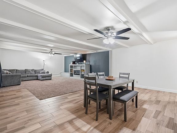 Step inside to a bright and open-concept floor plan that flows effortlessly from the spacious living area to the dining room—perfect for both relaxing evenings and entertaining guests. The kitchen features light gray cabinets, tiled countertops, and a coordinating tiled backsplash, combining classic style with practical functionality for everyday use.