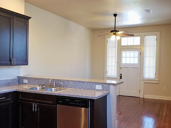 Unit has open living room/kitchen floor plan- ideal for entertaining- with beautiful refinished original hardwood floors, full bath, large independent bedrooms, granite countertops, solid wood cabinets, and stainless steel appliances (including dishwasher). Central A/C and Heat. Wood floors throughout, lots of storage/closet space. Rear bedroom has large walk-in closet. Central AC/Heat. Ceiling fans in each bedroom. Large front porch and rear deck, exterior security lighting. Off-street parking for one vehicle.
