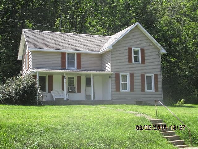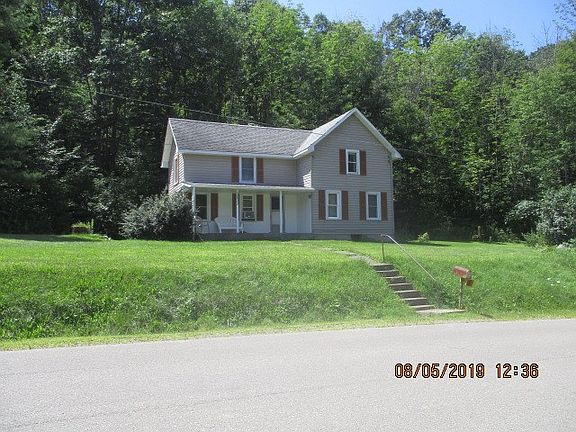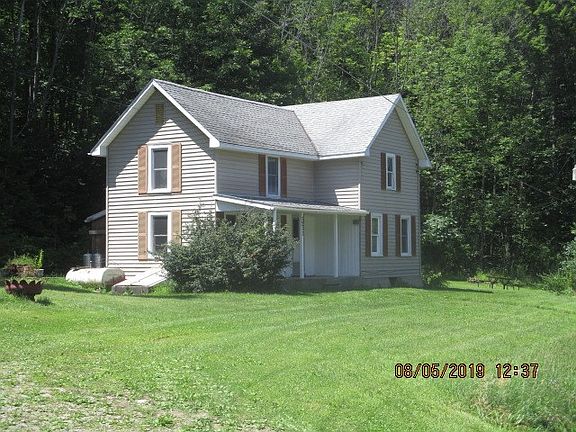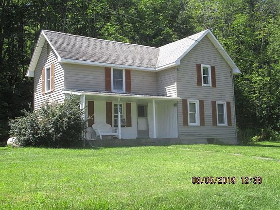 Lovely old farmhouse w/ vinyl siding, new windows down, 36 ACRES of woods & open land. Sun porch off kitchen. 2 barns but both need work are across from house. Great setting.
