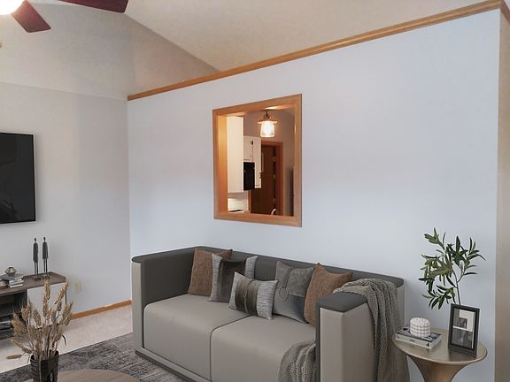 Cathedral ceilings, plant shelf, fenced yard, kitchen appliances and washer and dryer included.
