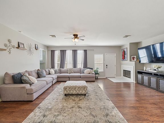 The spacious family room features a cozy corner fireplace and flows seamlessly into the open kitchen, complete with warm wood cabinetry, stainless steel appliances, a gas range, and a generous double-door pantry.