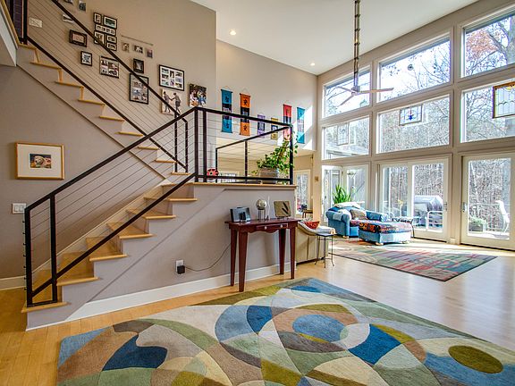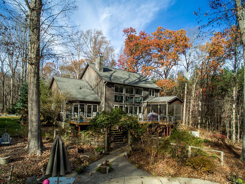 Custom built home explodes with a modern take on rustic charm. Dramatic contemporary 2 story living room with floor-to-ceiling windows, porcelain tile fireplace,maple flooring. Chef's kitchen with gas stove top, double oven,wine chiller. 1st floor master suite. 4 bedrooms, 3.5 baths,dining room,screened sun room overlooks in-ground swimming pool and fenced yard. Partially finished daylight basement has full bath & loads of potential. 10+ acres and no HOA fees! Less than 30 minutes to Duke or Chapel Hill!