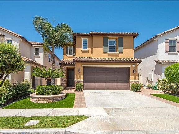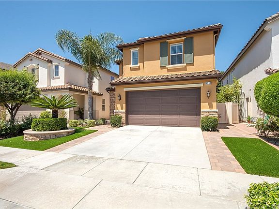 Built in 2012, this stunning Donovan Ranch home features 4 bedrooms, 3 bathrooms & 2,525 sqft of living space. Wonderful curb appeal with synthetic lawn, pavers, & stacked rock accents. The entrance is highlighted with its dramatic high ceilings, recessed lights, and tiled floors. Dream kitchen with a center island complete with counter bar, granite counters, stainless appliances, 5-burner gas cooktop, espresso cabinets, & walk-in pantry. There is a separate dining area convenient to the kitchen. The open floor plan also features a large family room with a cozy fireplace, lots of natural light, & overlooks the backyard. There is a bedroom and bathroom located on the first floor. The designated laundry room is on the 2nd level with a utility sink, & storage cabinets. The upstairs has 2 good sized bedrooms & a full bath complete with dual sinks! The loft offers a great place for T.V., game room, or study area with a built-in desk & storage cabinets. The master bedroom boasts a walk-in closet & ensuite bathroom featuring dual sinks, a relaxing soak tub, separate shower, and large walk-in closet. Enjoy the low maintenance back yard offering a beautiful patio cover, pavers, outdoor sink, & planter. Additional features include crown moldings, recessed lighting, plantation shutters, in-wall speakers, panel doors, & central air conditioning. Direct access to the 2-car garage. Anaheim Union School District including Nationally ranked Oxford Academy.