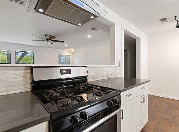 The updated kitchen is equipped w/ SS appliances, lots of cabinet space, tile back-splash, and built in floating shelves. Make your way down the hall where you will find your guest bedrooms and Master Suite - offering a full bath and walk-in closet. The private backyard hosts a cozy fire-pit, storage shed, covered patio, and ample garden beds. Located off of Brodie Lane and William Cannon, you are moments away from shopping, dining, and local schools with only a short commute to Downtown Austin!