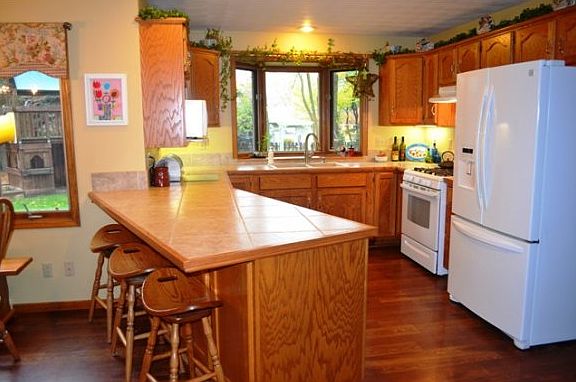 Quiet tree lined street on 1/4 acre setting! Bright & spacious living room. Sun drenched kitchen boasts tons of raised panel cabinets, tile counters, snack bar & dinette. Master suite offers walk-in closet & private bath. 1st floor laundry. Main level family room w/cozy fireplace & oversized patio doors leading to large deck that overlooks the completely fenced yard. Rainbow playset included.