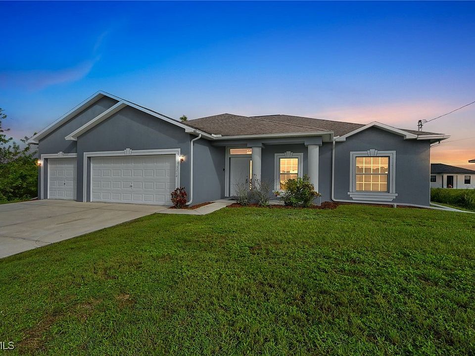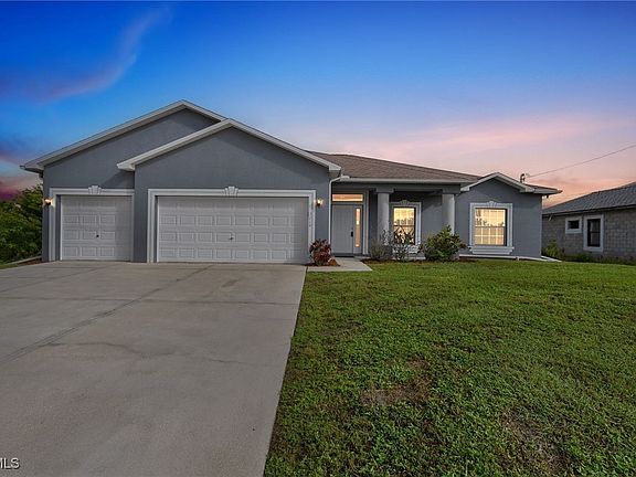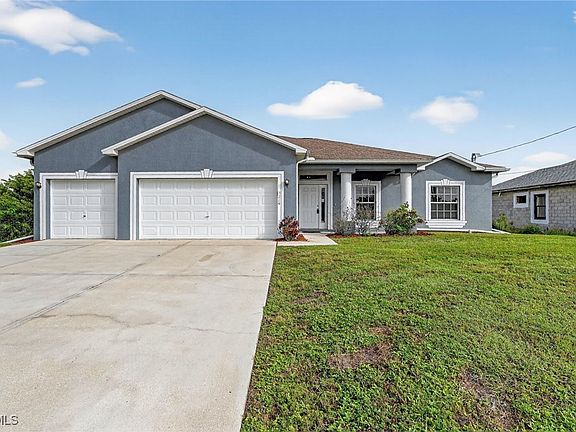 Welcome to the charming Lehigh Acres community and this outstanding home. With 4 bedrooms and 3 baths, all of your needs are covered. Starting outside, you'll immediately notice a fabulous concrete drive with plenty of additional parking. The 3 stall garage has room for tools, sports equipment and vehicles. Head inside to a bright and open floorplan full of warmth. You will appreciate the formal dining room at the front of the house and more private breakfast nook behind the perfectly located kitchen. Situated between your 2 dining areas, it makes cooking, serving, and entertaining a breeze. The stainless appliances and updated cabinetry look out over the living room and receive great natural light from the sunroom. This exceptional living space offers over 500 sq ft of functionality. Head out to the screened sunroom with concrete floor, perfect for peace & quiet and truly unwind from your day. Your favorite room in the new house might just be the owner's suite. With an en suite bath including a bathtub, shower, dual closest and dual sinks, you can sneak away and pamper yourself any time you like. There are 3 additional bedrooms, all with cozy new carpet. Two bedrooms share a jack and jill bath while the 3rd bedroom has a bath just outside the entrance. Welcome Home!